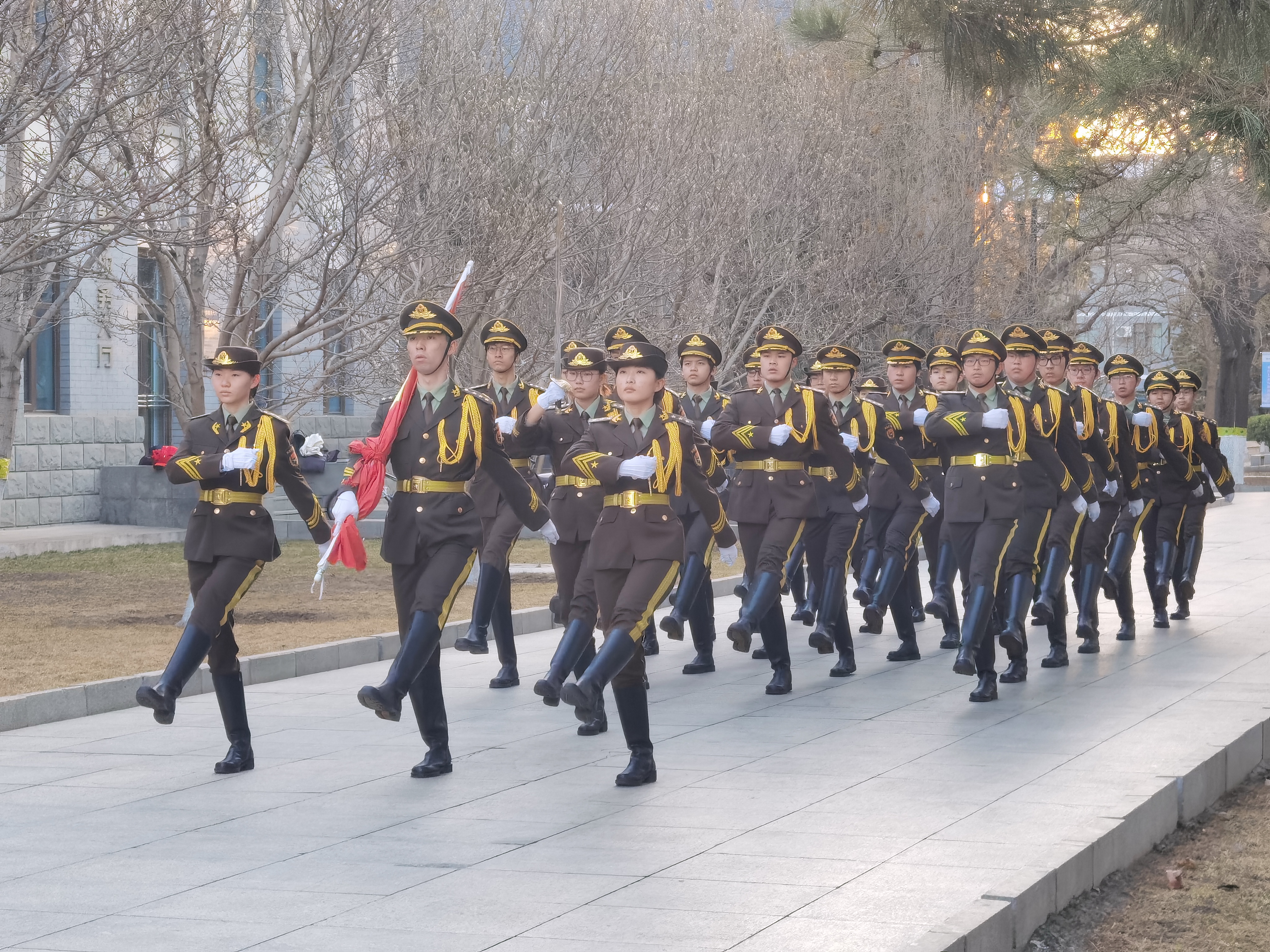 国旗班队员踏着铿锵有力的步伐,英姿飒爽,精神抖擞。五星红旗伴随朝阳冉冉升起,全体师生庄严肃立,奏唱国歌。