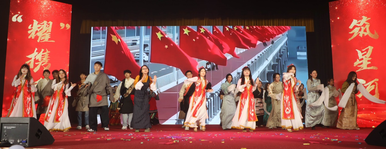 和合共鸣,梦想同行。歌曲《祖国不会忘记》传递出对祖国和时代的感恩与承诺;舞蹈《疆风藏韵舞中华》以优美舞姿展现民族和谐共融的画卷;晚会尾声,师生代表共同唱响《我们都是追梦人》,歌声嘹亮,情感真挚,将全场氛围推向高潮。